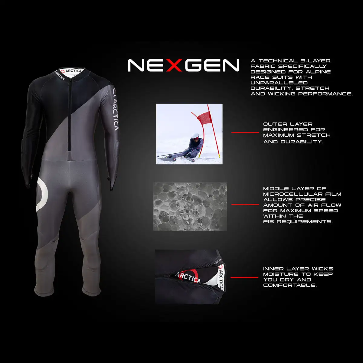 A technical 3-layer fabric specifically designed for alpine race suits with unparalleled durability, stretch and wicking performance.