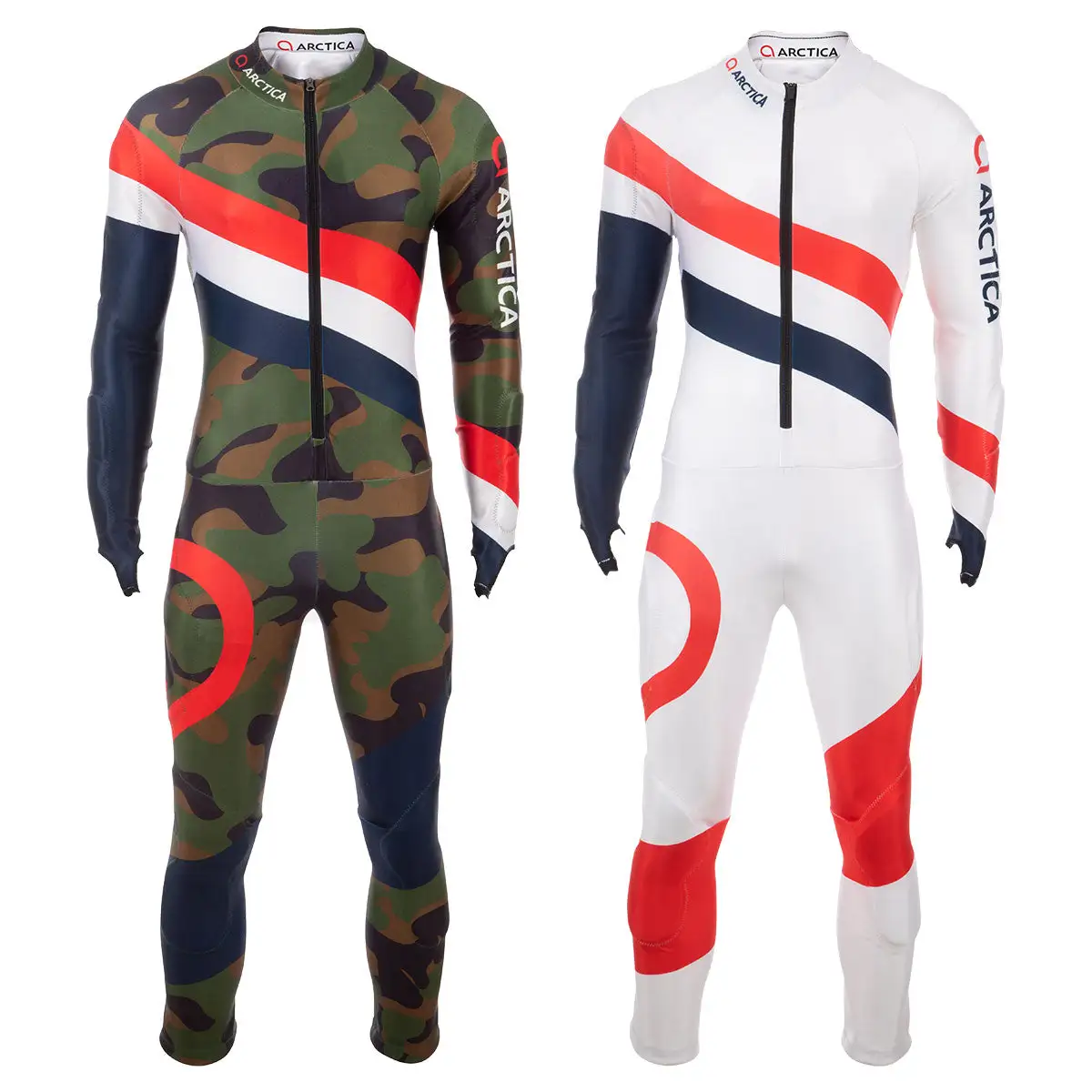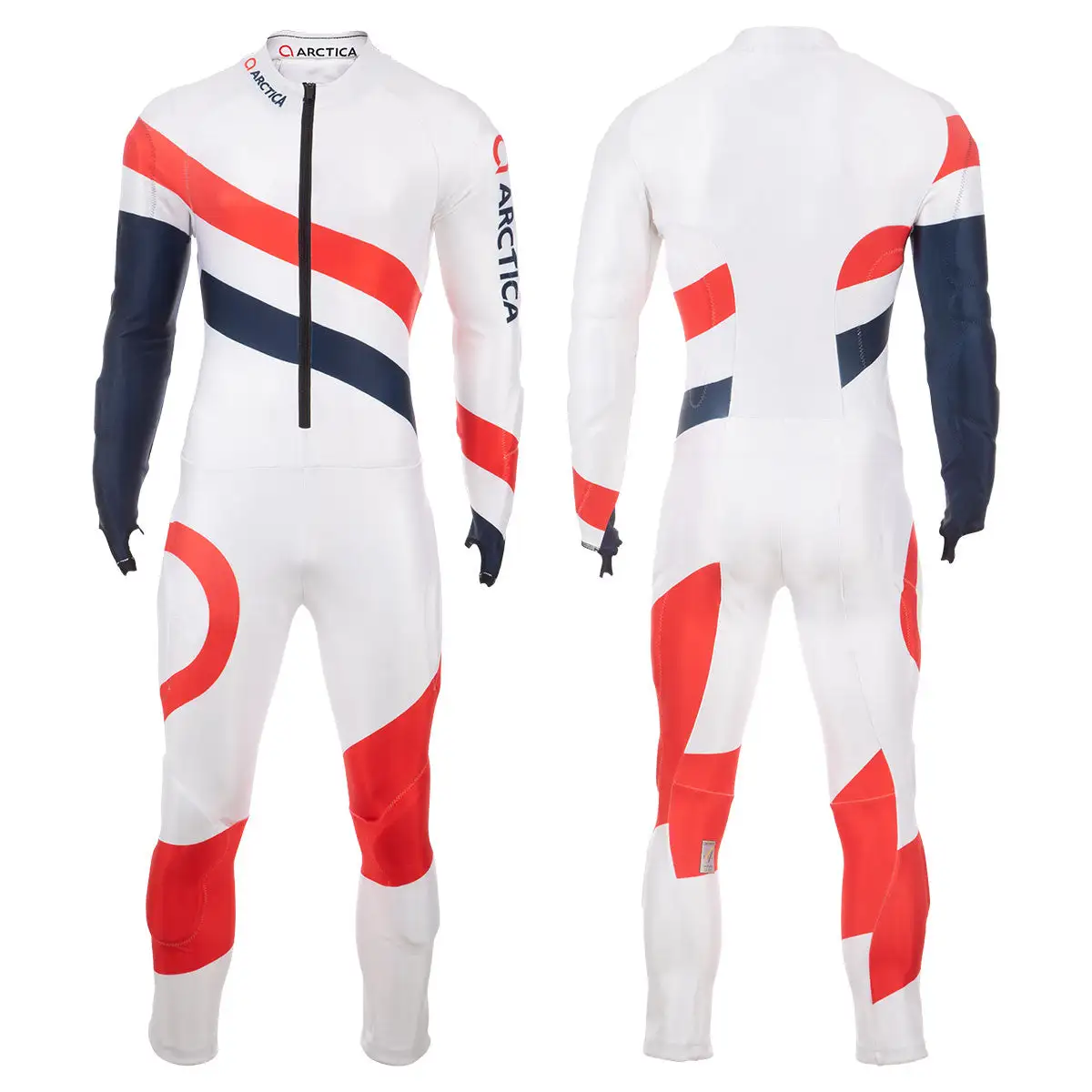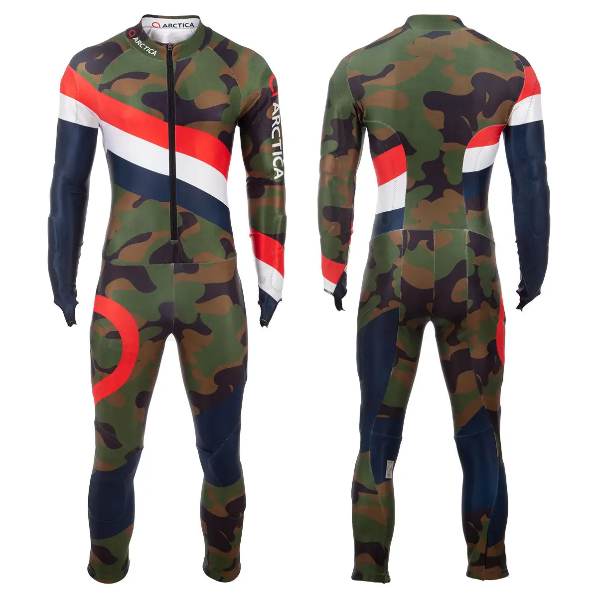 The Arctica GS Speed Suit with exclusive RACEFLEX fabric for unmatched quality, performance, and value. RACEFLEX is a highly durable three-layer stretch polyester that has high elasticity, accepts graphics incredibly well, and passes FIS air porosity requirements. The FIS logo printed on the back left leg ensures legality. Engineered with a nine-panel anatomical construction and elastic thread to provide the best possible fit. Each race suit is cut and printed individually using a special process to ensure bright colors and long-lasting graphics. Spring-loaded zipper pulls, and silicone cuff grips guarantee that your suit is in place and close to the body. Pads are removable to customize per racer preference.