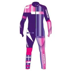 Karbon Junior GS suits have been designed using the insights and recommendations of World Cup athletes. An anatomical, snug fit ensures less wind resistance and increased speed. This ski race suit features 3-dimensional stretch, custom printed dye-sublimated Lycra with padded protection, thumb anchor loops and grip elastic at boot top. FIS logo is printed on the left leg to conform with current FIS regulations.