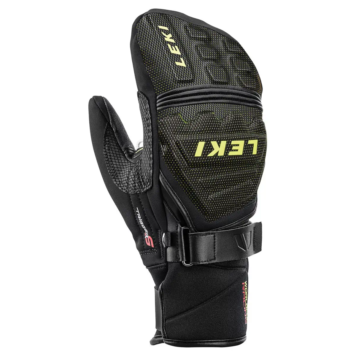 Sporty racing mitten with siliconized goatskin palm offers a sure pole grip. Designed with slightly bent fingers as if your hand is in the rest position delivers optimum comfort. 3D pads on every finger reinforced with ceramic provide a protective barrier between you and the race gates. The SOFT-TEX® insert is water- and windproof, providing perfect climate management. The Trigger S safety system lets you click onto or off of the pole lightning fast.