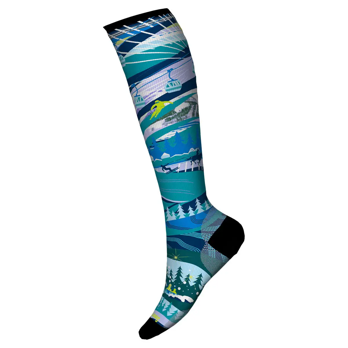It’s time to hit the hills in style! These no-cushion women’s wool ski socks are purpose-built for comfort and durability. With attributes such as a women’s specific fit and a wider, more comfortable welt, this sock is sure to fit right and stay put from your first turn to your last. Plus, its colorful ski and boarding print will cheerfully reflect your style and your love of the mountains.